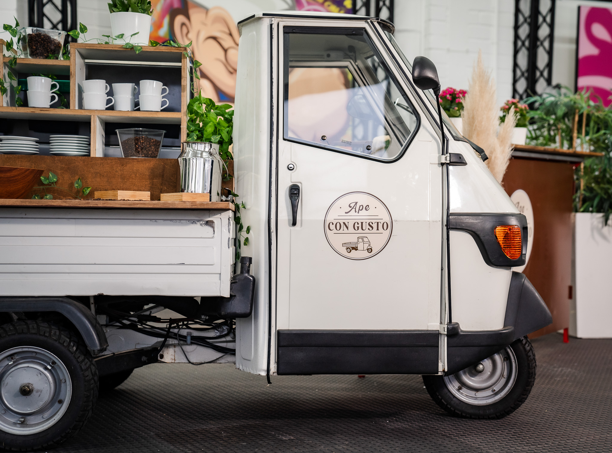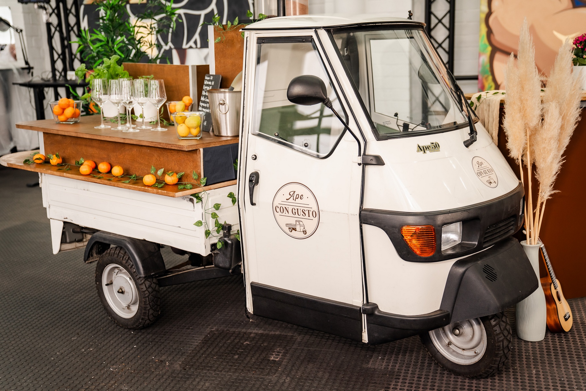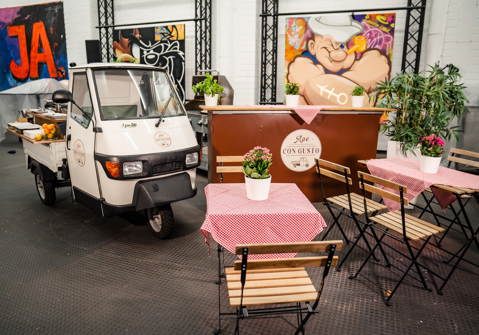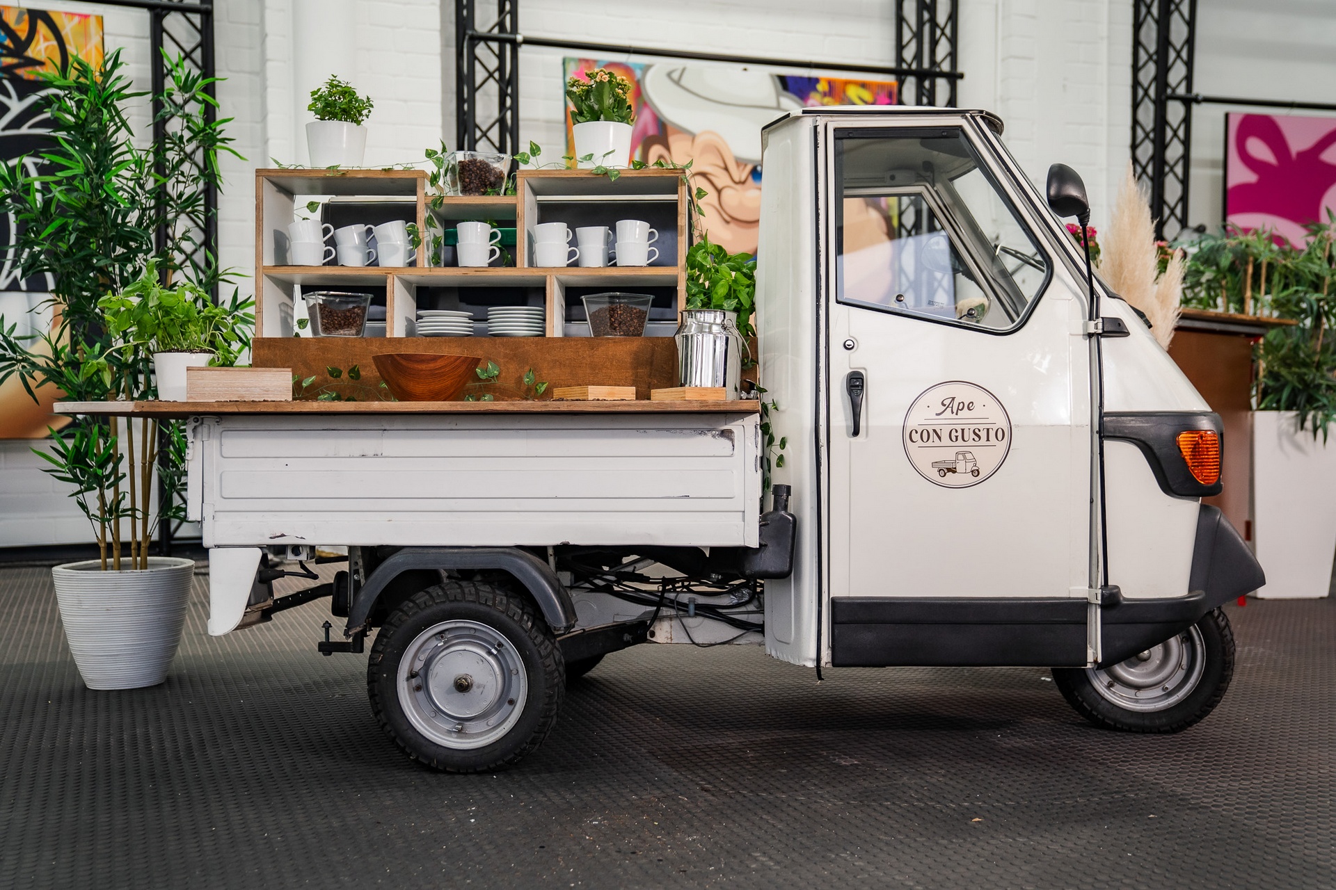 Unsere Ape, individuell konfigurierbar für Kaffee, Cocktails, Snacks oder vollwertiges Catering - ergänzt durch BBQ-Module, Foodtruck-Option und passende Möbel