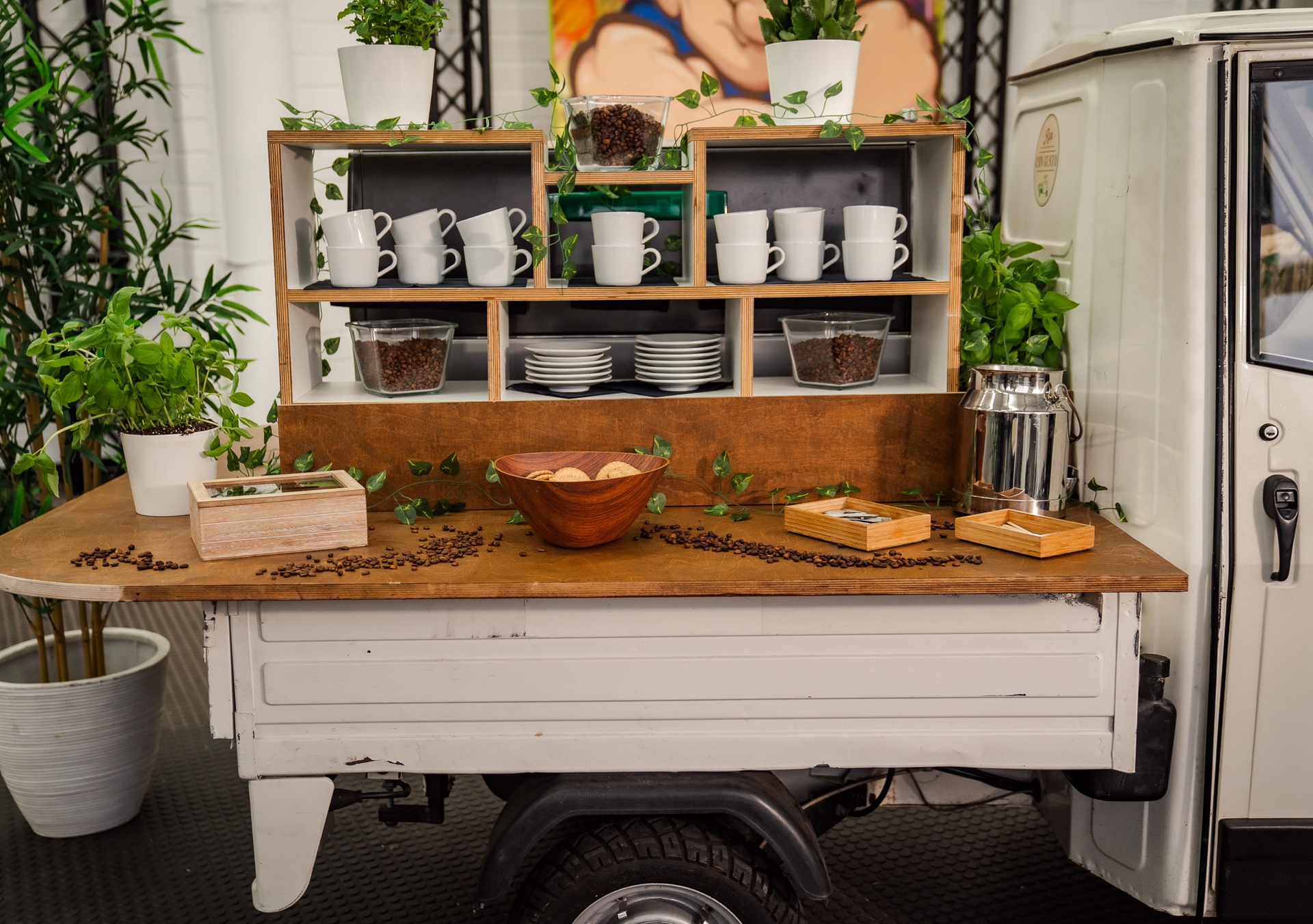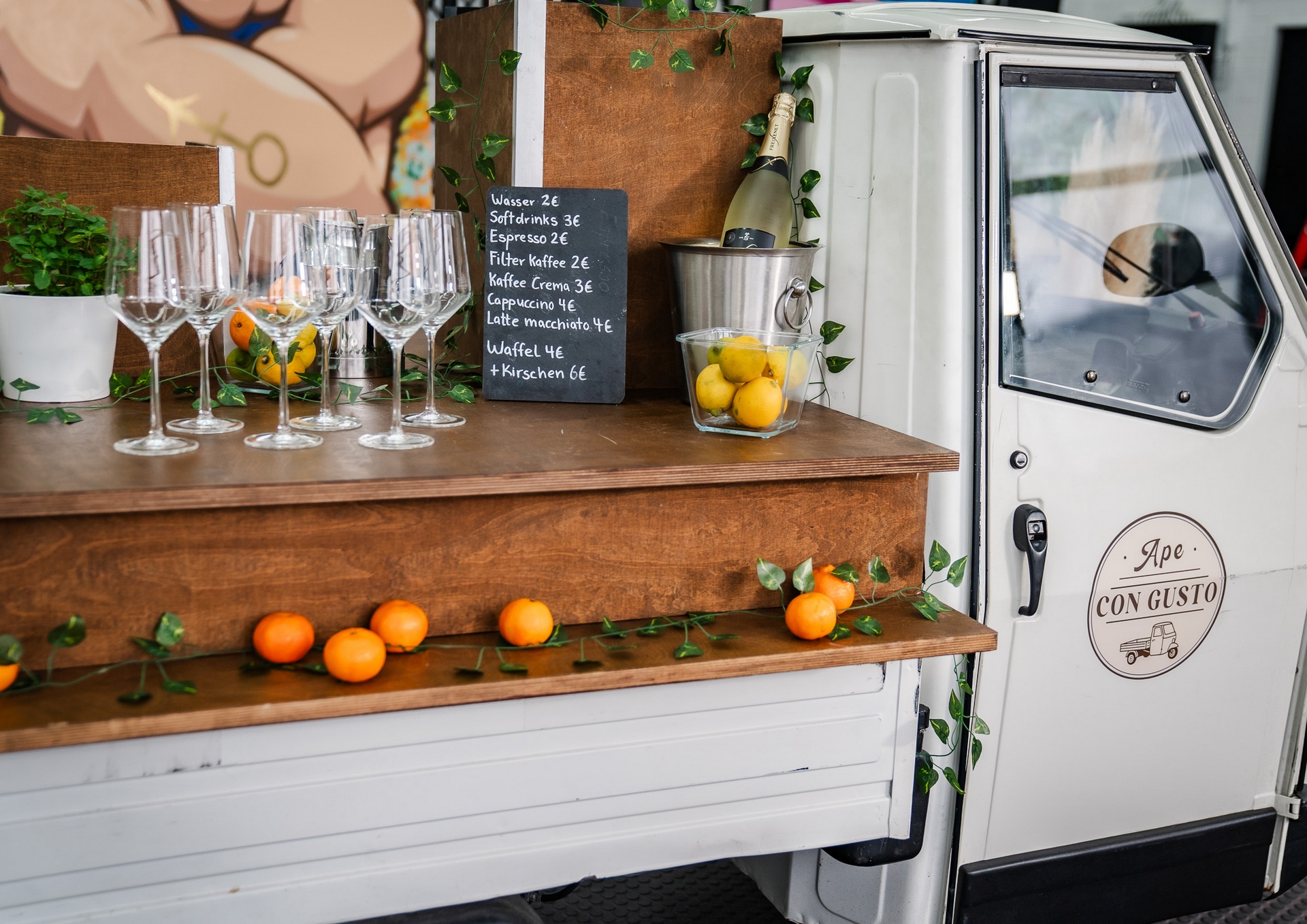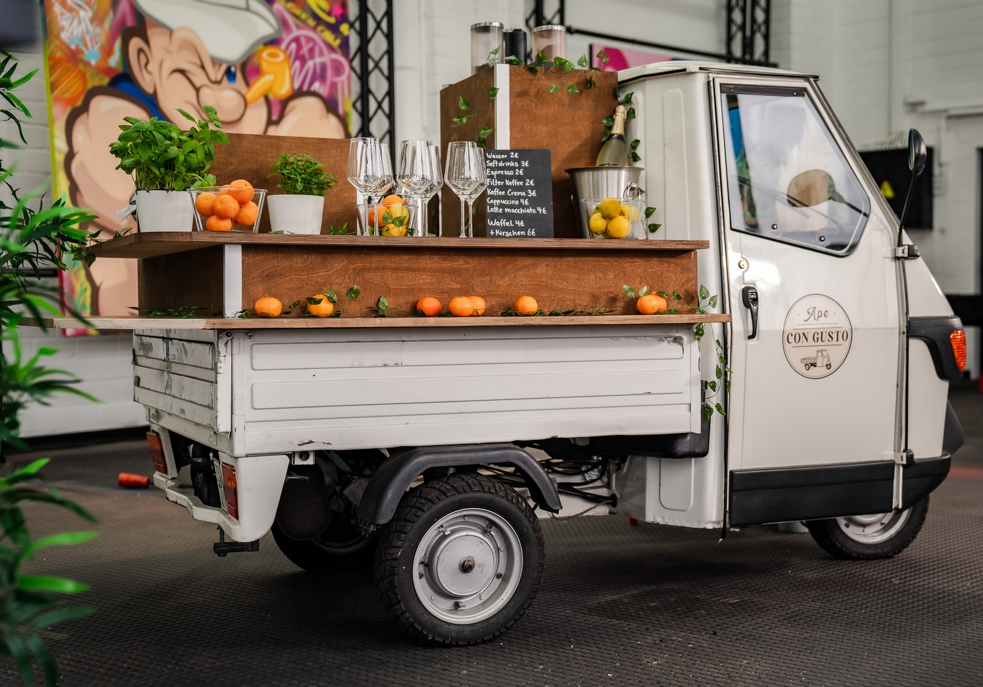 Unsere Ape macht nicht nur optisch was her. Durch den modularen Aufbau bieten wir die Möglichkeit in kurzer Zeit das Setting für Ihr Event komplett zu ändern. z.B. morgens Kaffee, mittags Catering, abends Cocktails.